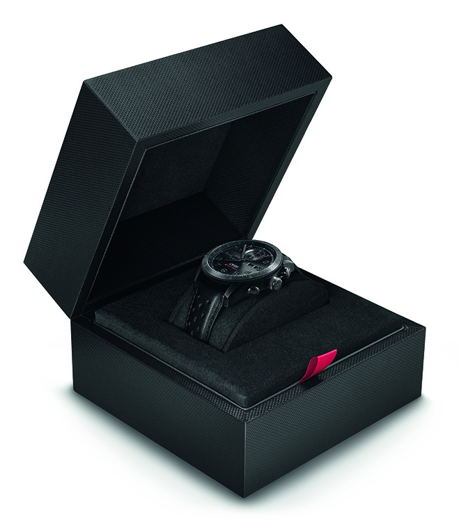 Новый спортивный хронограф «Oris Audi Sport Limited Edition II» укомплектован чёрным перфорированным кожаным ремешком гоночного стиля с раскладывающейся браслетной застёжкой из титана с чёрным DLC-покрытием. К часам также прилагается сертификат и специальная коробка.