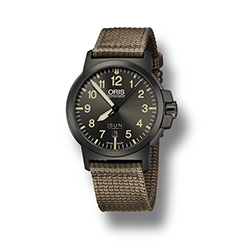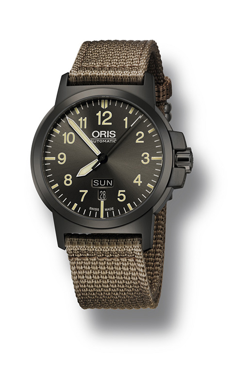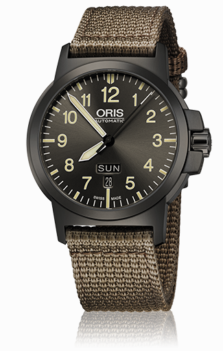 10. Oris Aviation BC 3 Advanced Day Date 01 735 7641 4263-07 5 22 22G Многокомпонентный корпус из нержавеющей стали с PVD-покрытием цвета серой оружейной стали. Тёмно-серый циферблат с арабскими цифрами одинаковой величины, условными часовыми индексами и стрелками, покрытыми люминесцентным составом «Superluminova» цвета «old radium». Тёмно-бежевый текстильный ремешок с застёжкой из нержавеющей стали с PVD-покрытием серого цвета. |
