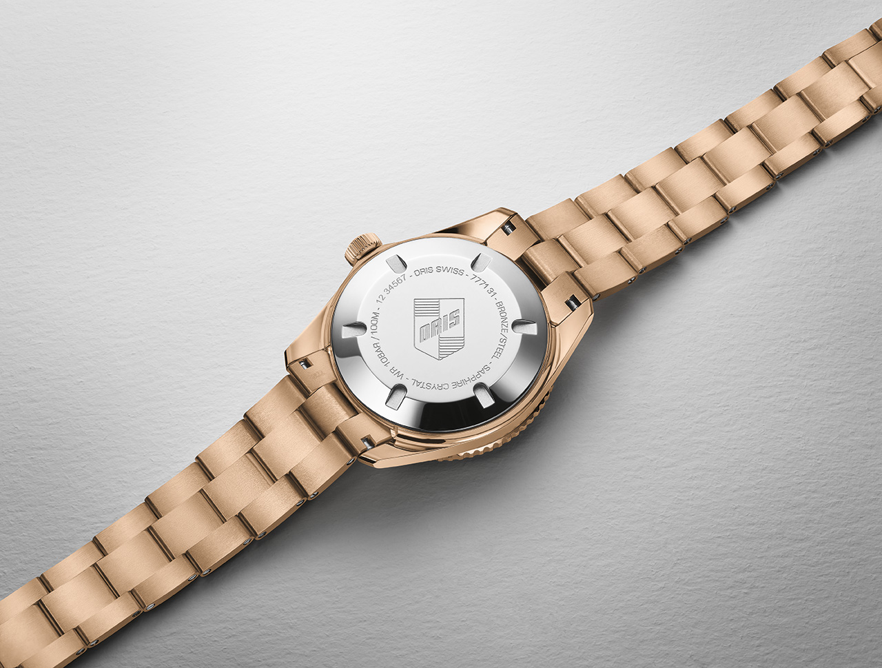 - Корпус: Бронзовый корпус диаметром 38 мм, оснащенный однонаправленным вращающимся безелем и завинчивающейся бронзовой заводной головкой. Задняя крышка из нержавеющей стали украшена логотипом Oris.