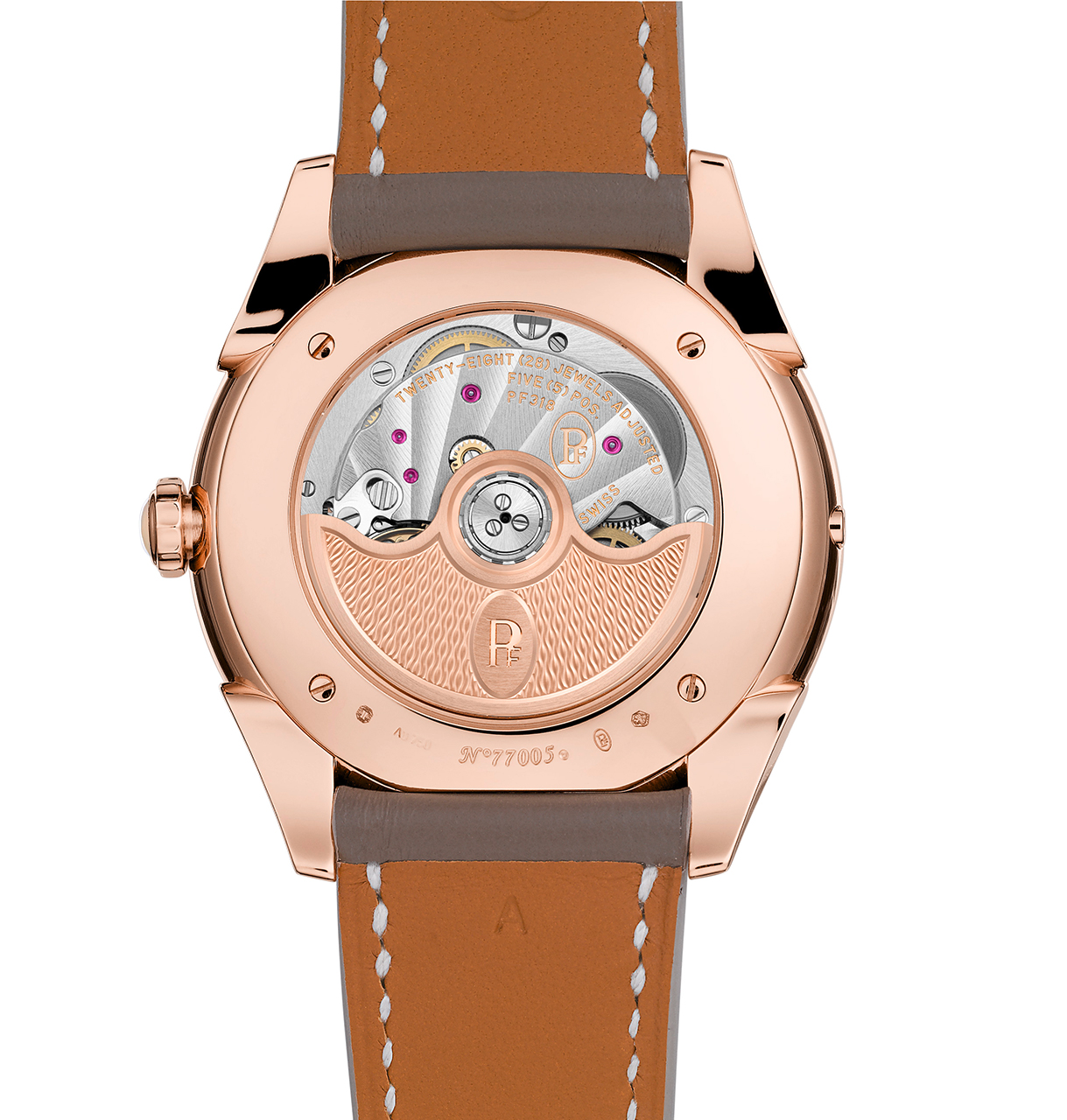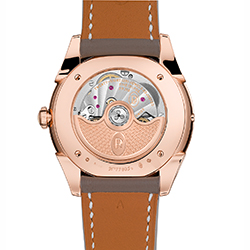 Модель Tonda Métropolitaine оснащена мануфактурным механизмом PF310 с автоматическим подзаводом и инерционным грузом из золота и имеет корпус диаметром 36 мм с безелем, украшенным 46 бриллиантами чистотой IF и весом 1,8 карата. По шкале чистоты IF (Internally Flawless) означает «без внутренних включений» и максимально возможный уровень качества: чистый алмаз даже при исследовании через лупу с 10-кратным увеличением. Часы с авантюриновым циферблатом впечатляют мерцанием ясного ночного неба, где каждое из медных вкраплений передает красоту сияния звезд. Часовая и минутная стрелки-скелетоны принимают форму листа шалфея, а маленькая секундная стрелка располагается у отметки «6 часов». Заводную головку украшает синий сапфир огранки кабошон. Дополняет эти роскошные часы ремешок марки Hermès из кожи аллигатора цвета индиго.
