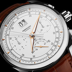 - Механизм встроенного хронографа, сплит-функция, большой указатель даты.