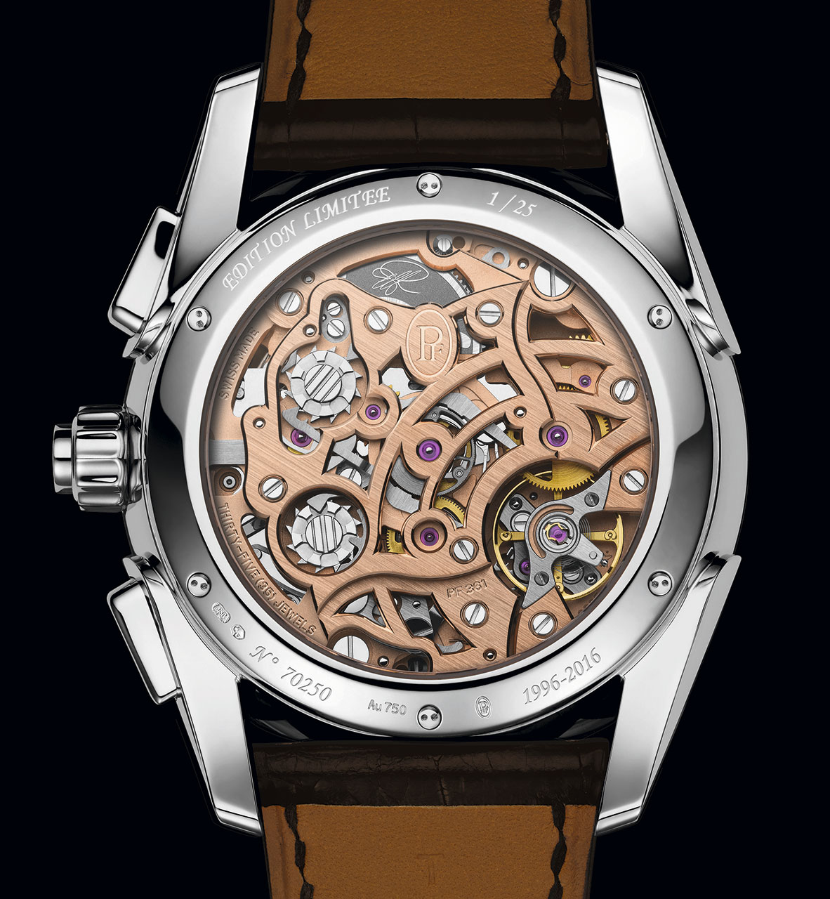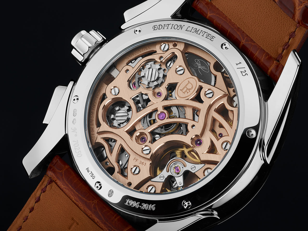 Калибр PF361, полностью изготовленный внутри часовой мануфактуры, отличается не только техническими характеристиками и особыми функциями, но и исключительной эстетикой. Благодаря открытой конструкции, которая позволяет увидеть калибр и помогает визуально оценить его исключительные характеристики, этот механизм хронографа приобрел еще большую надежность и эстетическую привлекательность. Для того чтобы подчеркнуть изысканность этого механизма, он был оснащен множеством внутренних углов. Внутренние углы должны быть скошены и отполированы вручную. Ведь никакая машина не способна создать такие компоненты, сохранив плотность и неровность формы. Вот почему внутренние углы других моделей часов настолько немногочисленны или вообще отсутствуют в часовых механизмах более низкого класса. Тем не менее, калибр PF361 включает в себя большое количество углов – почти 50! Наряду с эффектом «ангельского крыла» они вносят свой вклад в подлинную красоту этого механизма встроенного хронографа.
