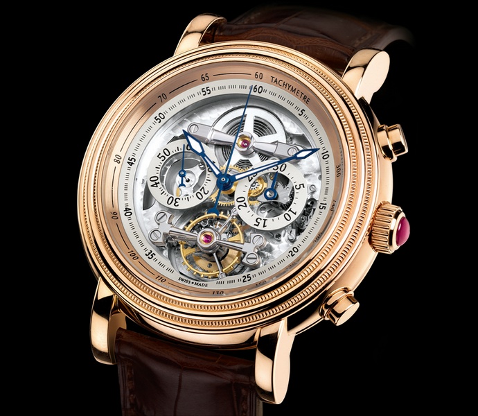 Еще одна заметная модель – Toric Tourbillon – часы с турбийоном и ручным подзаводом Limited Edition, корпус – 18-каратное розовое золото. Не многие часовые салоны могут позволить представлять на экспозиции часы с турбийоном – это сложнейший и дорогой механизм.