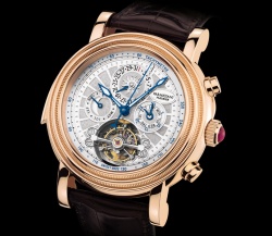 Выдающиеся возможности мануфактуры Parmigiani воплощены в модели TecnicaCosmos. В корпусе из розового золота и заводной головкой с рубином множество усложнений – турбийон, вечный календарь, хронограф, минутный репетир.