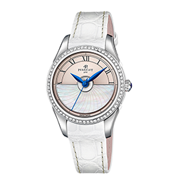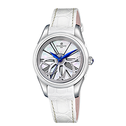 | 1. Модель A2065/4: циферблат из белого перламутра, оригинальные римские цифры, двойной ротор в форме ажурных лепестков с бриллиантовой отделкой – 19 бриллиантов (0,04 карата) Top Wesselton, VS1, белый ремешок из кожи аллигатора. | |