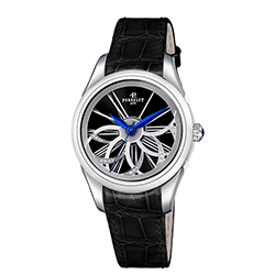 На циферблатах установлены центральные стрелки часов и минут листовидной формы синего цвета, а также тонкая синяя центральная секундная стрелка. Индикация на циферблате представлена римскими цифрами (I-XI) оригинальной формы у первых трёх моделей и чёрными римскими цифрами классической формы у двух последних моделей. Декоративная часть двойного ротора, безусловно, является главным элементом, привлекающим внимание к циферблату. У трёх «цветочных» моделей она инкрустирована бриллиантами, причём у первых двух – имеет одинаковый дизайн. Циферблаты двух последних моделей украшает декоративная часть двойного ротора в форме перламутрового полукруга.
