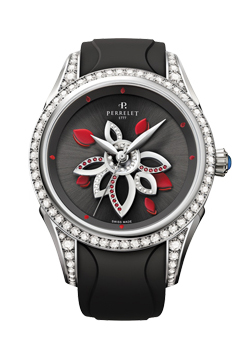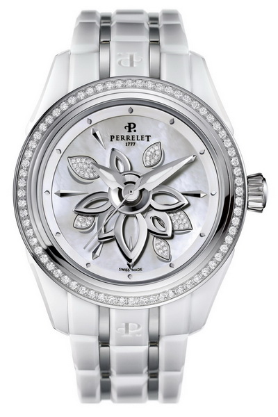 Бриллиантовый цветок, над которым возносятся стрелки, абсолютно синхронизирован с находящимся под циферблатом сектором подзавода, который обеспечивает постоянную «подпитку» калибра энергией. В дальнейшем, модель «Diamond Flower» несколько раз модифицировалась. Благодаря тому, что компания «Perrelet» не боялась экспериментов с новыми материалами, были созданы версии в керамическом корпусе со стальным рантом, а также варианты в корпусах из стали и розового золота.