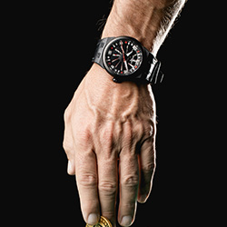 - Корпус: Диаметр 44 мм, центральная часть из поликарбоната и углеродного волокна, желобки, нержавеющая сталь с черным PVD-покрытием на безеле и задней крышке