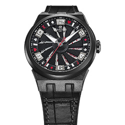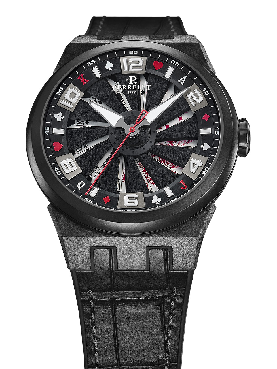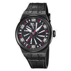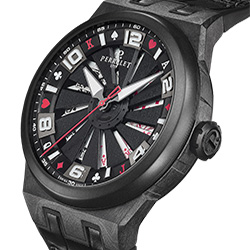 Вращающаяся турбина раскрывает мотив, изображенный на нижнем циферблате: чем быстрее вращение, тем четче иллюстрация. В новой версии часов представлены 12 карт: двойной роял-флеш и пара семерок. Дополнительную отсылку к картам можно увидеть на часовой дорожке: символы четырех мастей и цифры выделяются красным и белым на черном фоне, чередуясь с арабскими цифрами и индексами.