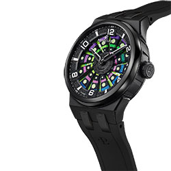 Часы заключены в титановый корпус с чёрным DLC-покрытием, а комплектный каучуковый ремешок подчёркивает их спортивный и современный характер.