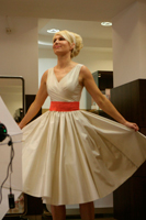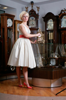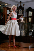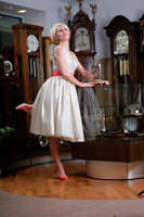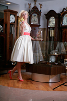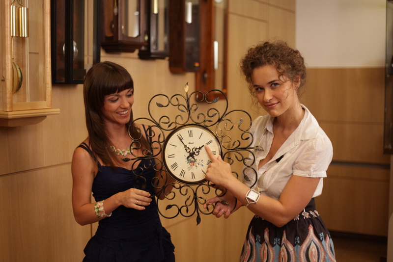 С чувственностью и роскошью Ольга Одинцова на "ты". Поэтому она мгновенно вжилась в образ "а ля белый лебедь" ... романтичной девушки, живущей сердцем. Ольгу даже уговаривать не пришлось на девичий блеск в глазах и невинную улыбку ... все получилось само собой. Казалось, еще чуть-чуть.. и около витрины появится прекрасный юноша, и галантно протянув руку, пригласит героиню на пируэт. А пока... пока она в ожидании его прихода посматривает на бронзовый циферблат К. Mozer.