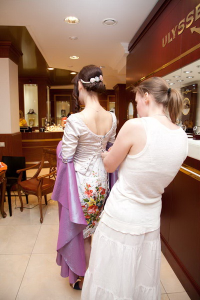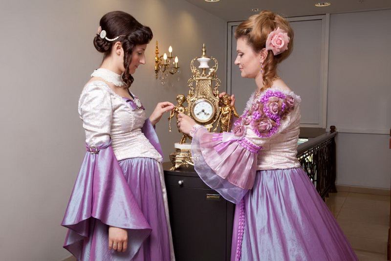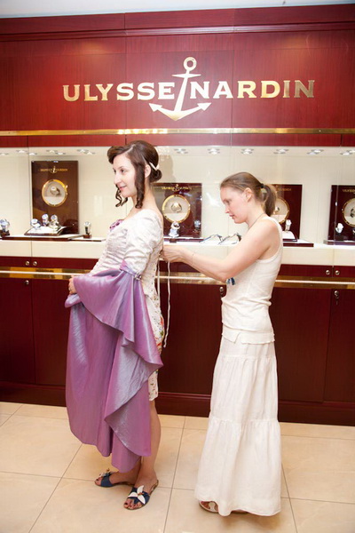 "А что это за красавицы-дамы, как будто на несколько часов перенесенные прямиком с Версальского бала-спектакля, поставленного на потеху мадам де Помпадур, в часовой салон. И вообще, что происходит", - вероятно, примерно так думал мужчина, который пришел за часами как раз в самый разгар съемки. Нет-нет, а он оборачивался от витрины и с любопытством рассматривал Марию и Юлию, которые так вошли в образ, что их вполне можно было отправить на съемочную площадку какого-нибудь фильма про те времена, когда доблесть и честь прекрасной дамы были не пустым звуком, и каждый день при дворе устраивались пышные действа.