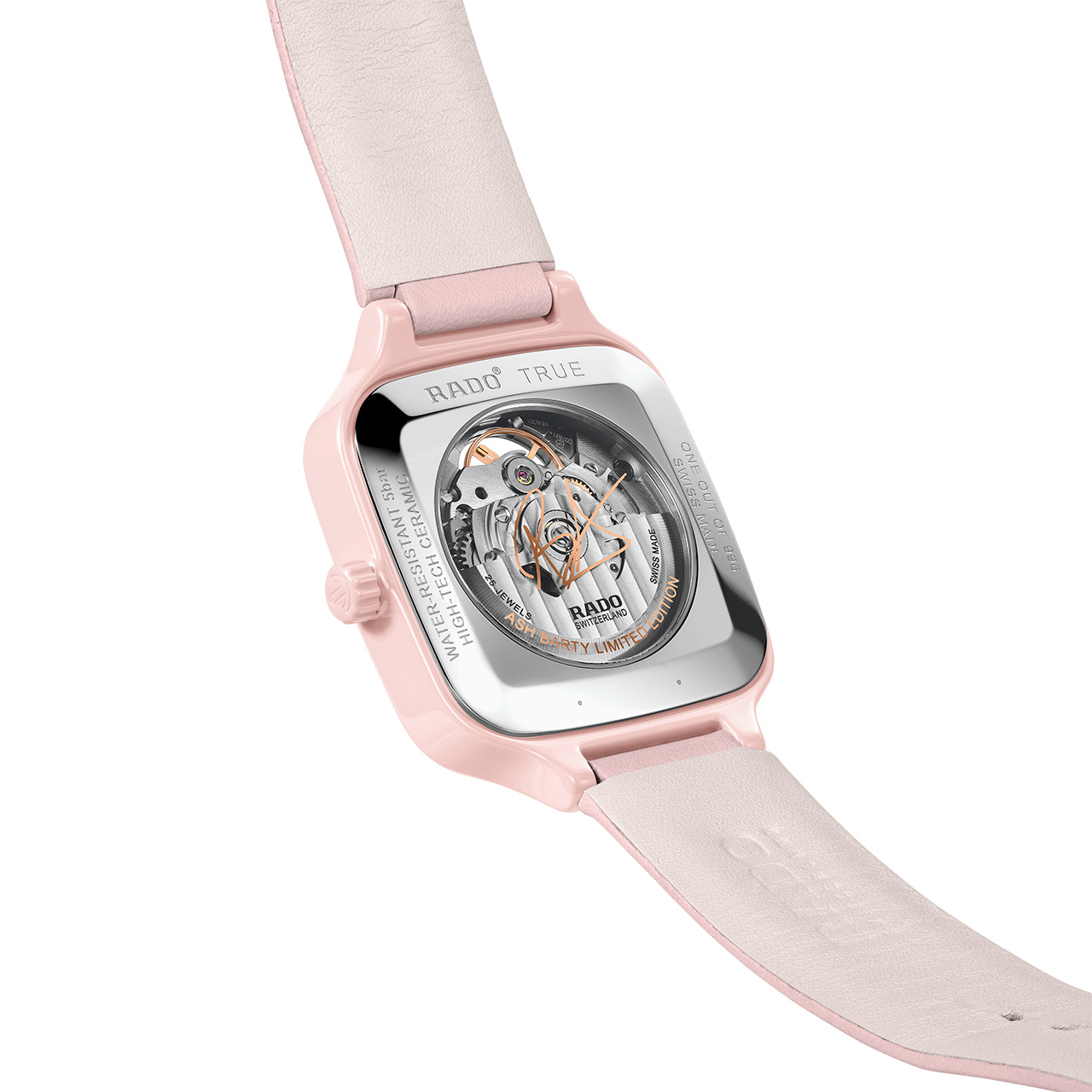 Дизайнерская коллаборация Ash Barty Limited Edition III, представляющая собой адаптацию классического True Square в фирменной высокотехнологичной керамике Rado, знаменует новые, захватывающие времена как для Эш, так и для бренда Rado. Женственные уникальные часы, которые будут радовать их владелицу днем и ночью, помещены в светло-розовый высокотехнологичный керамический квадратный корпус. Белый перламутровый циферблат с нанесенными индексами цвета розового золота придает изделию роскошный вид. А вырез открывает интригующий вид на механику часов, напоминая о тяжелой работе, стоящей за блестящим внешним видом.