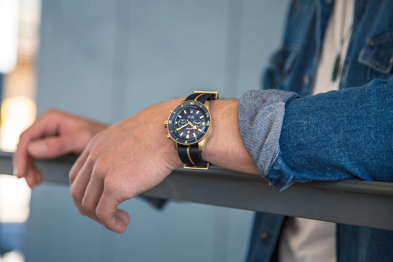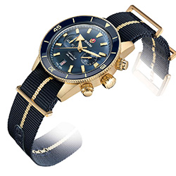 - Текстильный ремешок NATO синего цвета с линией золотистого цвета по центру, застежкой и петлями их полированной бронзы (CuAl).