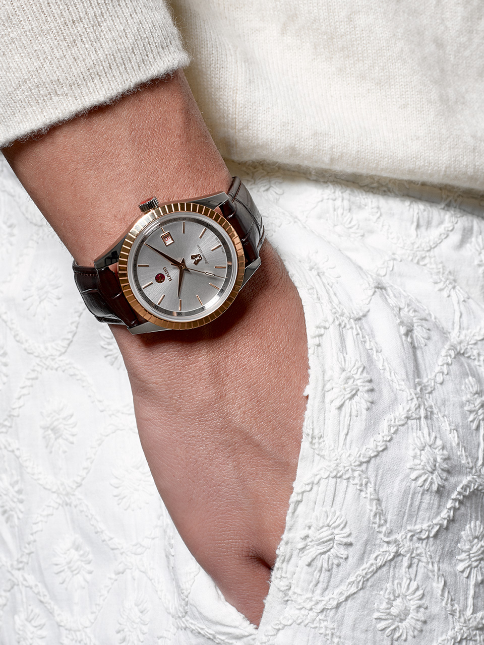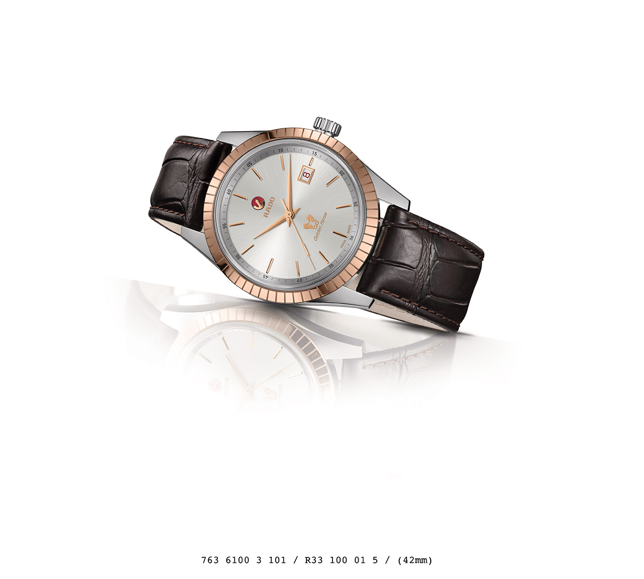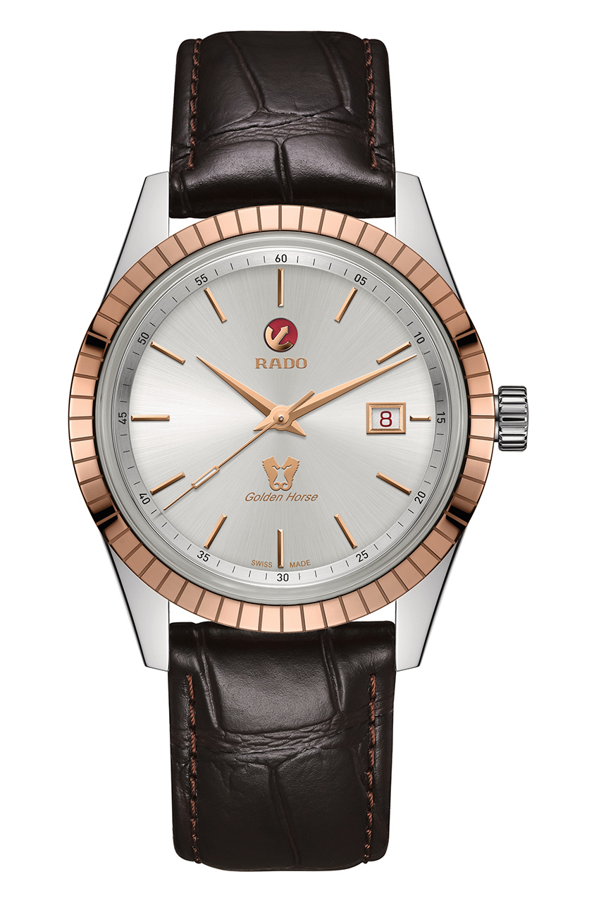 - Логотипы Rado и Golden Horse цвета розового золота.