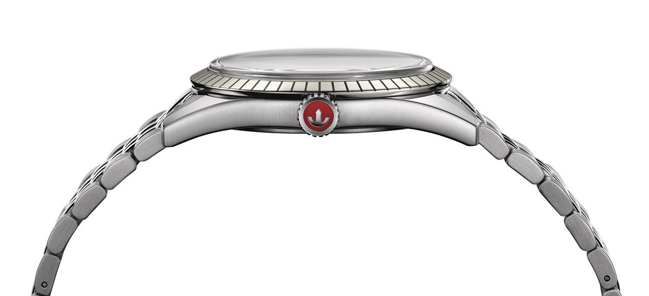 - Заводная головка из полированной нержавеющей стали с нанесенной лаком красного цвета точкой и изображением якоря цвета родия.