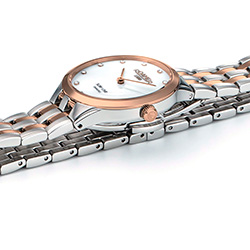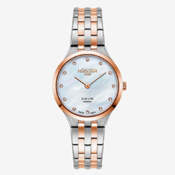 Модель SLIM-LINE DIAMOND доступна в нескольких вариантах: круглый безель и рифленая заводная головка выполнены из PVD цвета розового золота, желтого золота или нержавеющей стали. Часы водонепроницаемы до 5 АТМ и оснащены точным кварцевым механизмом Swiss Made Ronda 762-A2. Часы представлены в двух вариантах: в холодном серебристом цвете с браслетом из нержавеющей стали или в двухцветном дизайне с розовым или желтым оттенком, что позволяет каждому подобрать модель, отвечающую его индивидуальному образу и стилю.