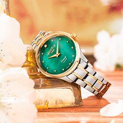 С 7 вариантами дизайна, Venus Diamond предлагает богатый выбор: элегантные часы из нержавеющей стали с белым или коричневым перламутром, выразительные модели с желтым золотым или розовым золотым покрытием и циферблатами зеленого или синего цветов. Корпус из нержавеющей стали диаметром 30 мм., швейцарский кварцевый механизм Ronda 762-A2, водонепроницаемость до 5 АТМ. Благодаря элегантному и стильному виду, Venus Diamond является потрясающим аксессуаром под любой образ своего владельца.