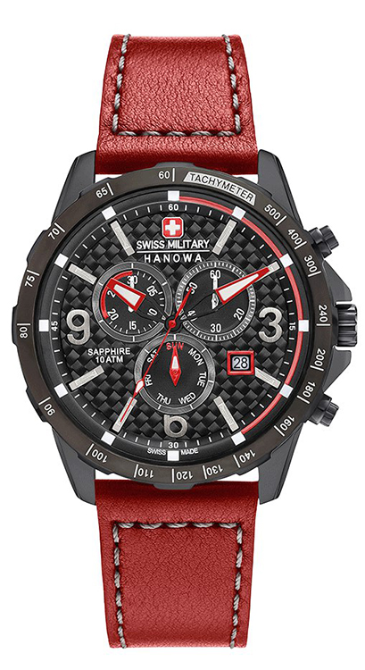 | 1. Swiss Military Hanowa Ace Chrono 6-4251.13.007: стальной корпус с чёрным PVD-покрытием, чёрно-серый циферблат, красный ремешок. | |