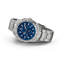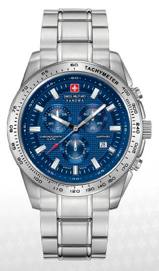 | 8. Swiss Military Hanowa Crusader Chrono 6-5225.04.003: корпус из нержавеющей стали 316L, серебристый безель с тахиметрической шкалой, синий циферблат с часовыми индексами серого цвета, браслет из нержавеющей стали. | |