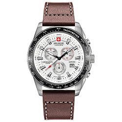 | 1. Swiss Military Hanowa Crusader Chrono 6-4225.04.001: корпус из нержавеющей стали 316L, безель с чёрным ионным покрытием и тахиметрической шкалой, белый циферблат с часовыми индексами стального цвета, коричневый кожаный ремешок с белой прострочкой. | |
