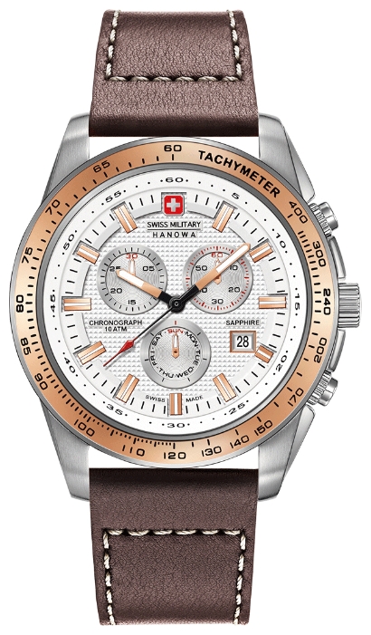 | 2. Swiss Military Hanowa Crusader Chrono 6-4225.04.001.09: корпус из нержавеющей стали 316L, безель с ионным покрытием розовой позолотой и тахиметрической шкалой, белый циферблат с часовыми индексами цвета розового золота, коричневый кожаный ремешок с белой прострочкой. | |