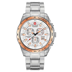 | 7. Swiss Military Hanowa Crusader Chrono 6-5225.04.001.09: корпус из нержавеющей стали 316L, безель с ионным покрытием розовой позолотой и тахиметрической шкалой, белый циферблат с часовыми индексами цвета розового золота, браслет из нержавеющей стали. | |