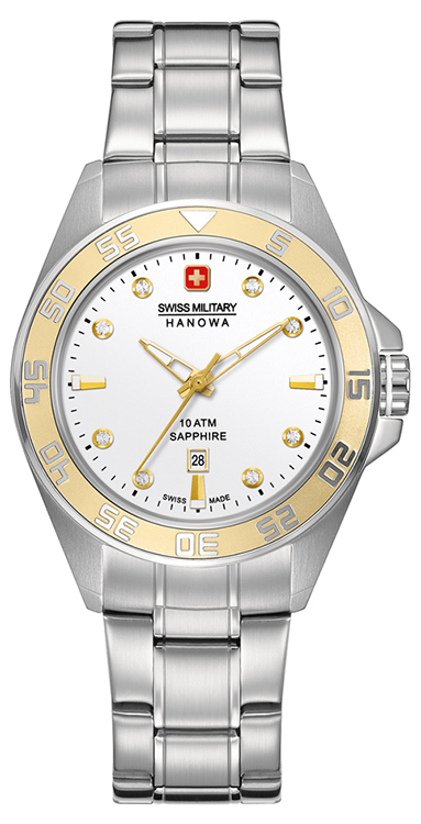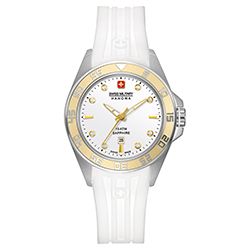- Swiss Military Hanowa Sword Lady 6-6221-04.001.02: серебристый корпус, золотистый безель, серебристый циферблат с восемью камнями циркония, белый ремешок.