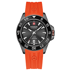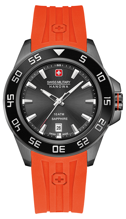- Swiss Military Hanowa Sword 6-4221-30-007: корпус с ионным напылением цвета оружейной стали, чёрный безель, черный циферблат, оранжевый ремешок.