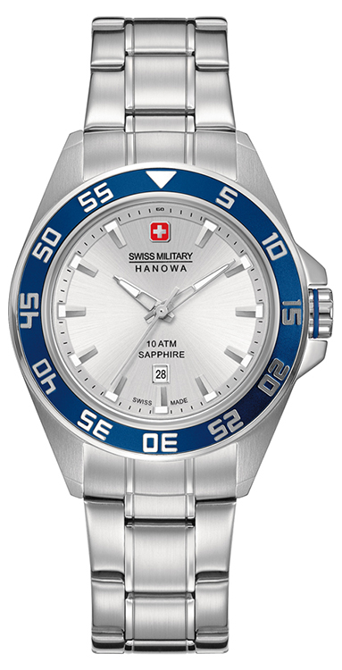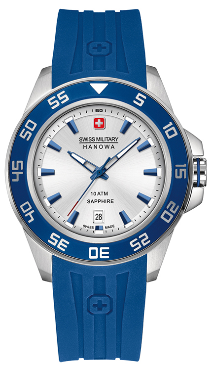 - Swiss Military Hanowa Sword 6-4221-04-001: серебристый корпус, синий безель, серебристый циферблат, ремешок синего цвета.