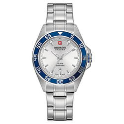 - Swiss Military Hanowa Sword Lady 6-6221-04.001.03: серебристый корпус, синий безель, серебристый циферблат, синий ремешок.