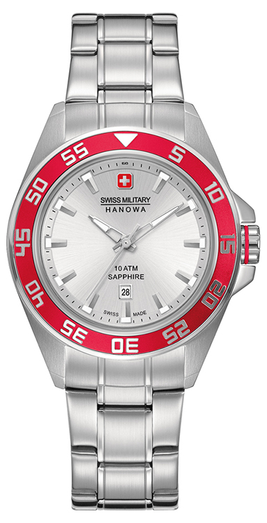 - Swiss Military Hanowa Sword Lady 6-7221.04.001.04: серебристый корпус, красный безель, серебристый циферблат и серебристый браслет.