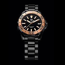 3. Tag Heuer Aquaracer Lady 300M WAY1355.BH0716 2016 HD Корпус из полированной чёрной керамики. Стальной полированный безель с розово-золотым 18-каратным PVD-покрытием. Чёрный циферблат с центральными стрелками и условными индексами с PVD-покрытием розовым золотом 18-карат. 3-х рядный керамический чёрный полированный браслет с застёжкой-бабочкой на предохранительных кнопках. |