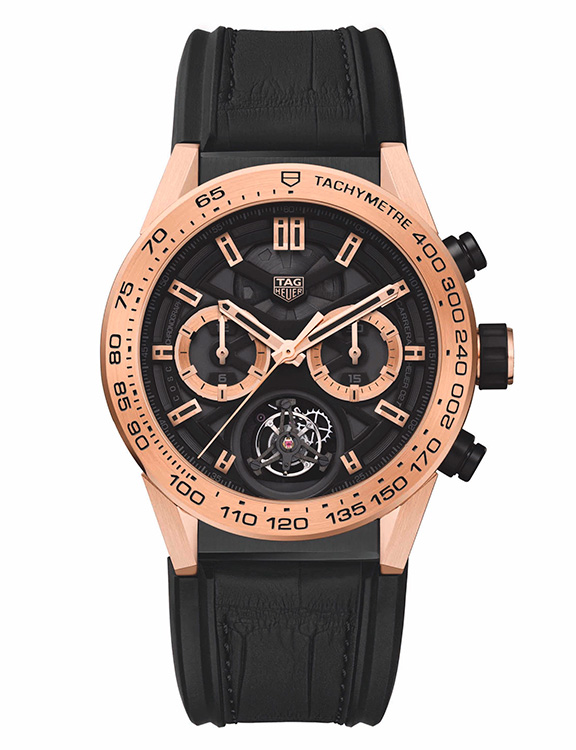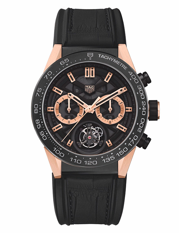 | 3. TAG Heuer Carrera Heuer-02Т Tourbillon Titanium and Rose Gold/ Ceramic Bezel CAR5A5Y. FC6377: титановый корпус с чёрным покрытием из карбида титана, кроме проушин для ремешка из 18 каратного розового золота, чёрный керамический безель с серой тахиметрической шкалой; чёрный циферблат с условными часовыми индексами, стрелками и счётчиками хронографа из титана с гальваническим покрытием из 18-каратного розового золота, с тёмно-серой надписью «COSC» между отметками «8 и 9 часов»; чёрный кожаный ремешок, титановая раскладывающаяся застёжка с чёрным покрытием из карбида титана, предохранительными кнопками и символом марки «TAG Heuer». | |