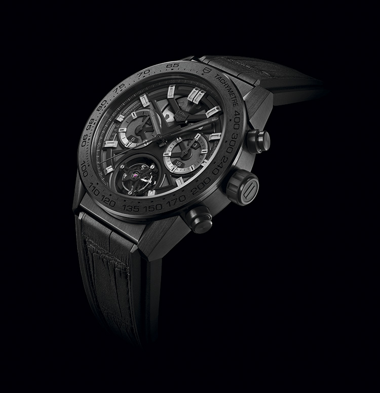 | 2. TAG Heuer Carrera Heuer-02T Tourbillon «Black Phantom» Limited edition CAR5A8Z. FC6377: модель «all black» ограниченной серии в количестве 250 индивидуально пронумерованных экземпляров: титановый корпус с чёрным покрытием из карбида титана всех его металлических элементов, чёрный керамический безель с серой тахиметрической шкалой; чёрный циферблат с условными часовыми индексами, стрелками и счётчиками хронографа из титана чёрного цвета, с серой надписью «COSC» между отметками «8 и 9 часов»; чёрный кожаный ремешок, титановая раскладывающаяся застёжка с чёрным покрытием из карбида титана, предохранительными кнопками и символом марки «TAG Heuer». | |