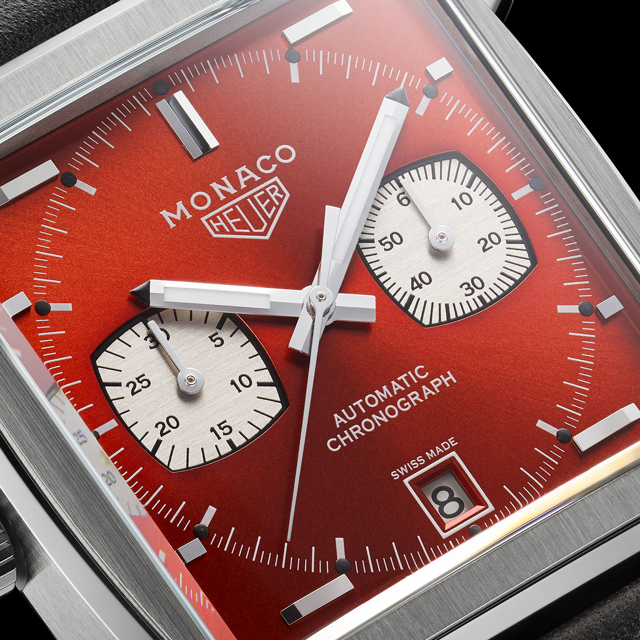 Вторые из пяти коллекционных моделей TAG Heuer отличаются огненно-красным циферблатом, который созвучен передовому дизайну и гоночному духу. Представленные на черном кожаном ремешке с перфорацией красного цвета, эти часы отражают стиль второй декады эпохи Monaco. Знаковый квадратный корпус из нержавеющей стали дополнен красным циферблатом с узором sunray, двумя квадратными счетчиками со скругленными краями с родиевым покрытием. Черно-белые акценты на циферблате отлично сочетаются с чернеными минутной и часовой стрелками. Стрелки и метки покрыты Super-Luminova® для лучшей считываемости показателей.