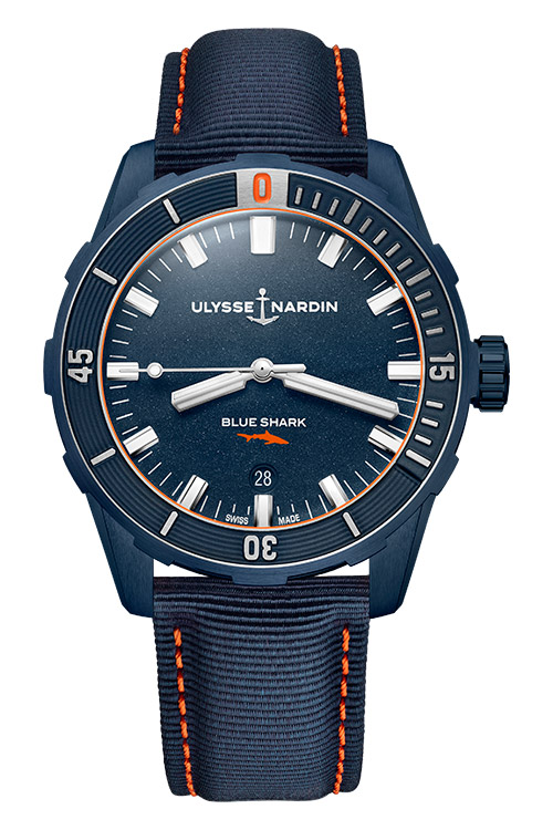 Модель из лимитированной коллекции Diver Blue Shark Limited Edition (выпущена в количестве 300 экземпляров) выполнена из нержавеющей стали с PVD-покрытием. Синий циферблат гармонирует с цветом безеля. Ремешок декорирован ярко-оранжевой строчкой. На задней крышке нанесена гравировка синей акулы – по аналогии с белой акулой, изображенной на модели Diver Great White диаметром 44мм.