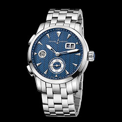 | 9. Модель Dual Time Manufacture 3343-126LE-7/93 лимитированная серия 1846 экземпляров: корпус из нержавеющей стали, синий циферблат, браслет из нержавеющей стали. | |