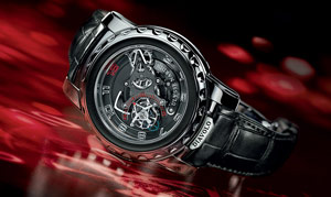 Чёрный ремешок из кожи аллигатора, оснащённый браслетной золотой застёжкой, надёжно удерживает на руке этот сложный, зрелищный, но функционально простой «механизм дьявола».