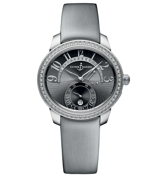 | 2. Ulysse Nardin Jade Jewellery White Gold 3100-125B/592: корпус из 18-каратного белого полированного золота, безель с бриллиантами круглой огранки общим весом 0,844 карата; графитовый циферблат, инкрустированный бриллиантами общим весом 0,332 карата; серый сатиновый ремешок с классической застёжкой из 18-каратного белого полированного золота. | |