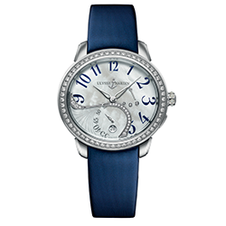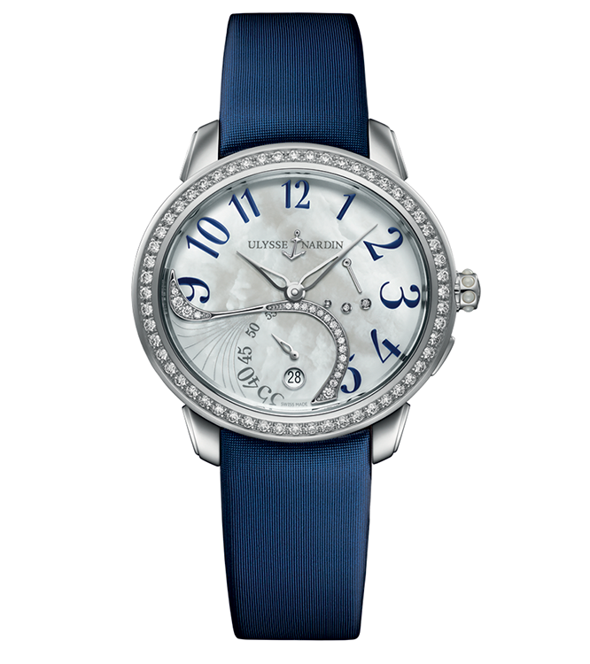 | 4. Ulysse Nardin Jade Jewellery Steel 3103-125B/591.3: корпус из нержавеющей стали, безель, украшенный бриллиантами круглой огранки общим весом 0,844 карата; белый перламутровый циферблат с инкрустацией из бриллиантов общим весом 0,332 карата; синий атласный ремешок с раскладывающейся застёжкой из нержавеющей стали. |