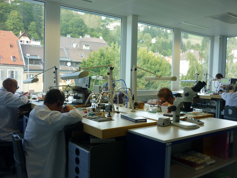 Скрупулезность и точность мастеров Ulysse Nardin поражала не раз. Некоторые детали, из которых собираются часы, настолько малы, что даже под лупой такие шестеренки выглядят очень маленькими. Естественно, в процессе обращения с деталями нужны максимальная собранность и сконцентрированность. Поэтому у каждого работника на фабрике есть свой личный график – отработал несколько часов, отдохнул и опять за работу. И если мужчины в основном занимаются разработкой идей коллекций и задействованы на технологически сложных участках, женщины выполняют более монотонную работу - например, одна из них всю смену тщательно шлифует винтик, вставляет в его паз.