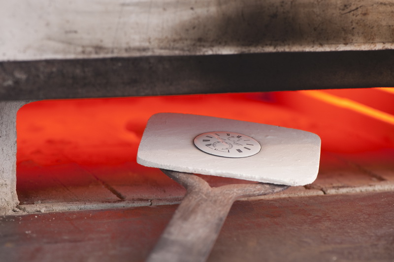 Процесс производства циферблатов с эмалевым покрытием до сих пор происходит вручную. Технология за более чем сто лет не изменилась. Каждый изготовленный циферблат – исключительное изделие штучной работы. Мы видели, как происходит процесс изготовления циферблатов Maxi Marine Chronometer. Заготовку будущего циферблата покрывают белым порошком, запекают и снова наносят слой порошка – пятикратный обжиг дает ровный белый цвет. Сколько по времени циферблату запекаться, мастер определяет на глаз, по интуиции - он также отвечает за данный процесс в Ulysse Nardin уже больше сорока лет. Затем с помощью мягкого трафарета наносят разметку на циферблат.