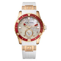 2. Ulysse Nardin Diver Lady 3202-190-3C/10.16 Корпус из полированного 18-каратного розового золота (5N). Безель с красным вулканизированным каучуковым покрытием и девятнадцатью бриллиантами общим весом 0,115 карата. Белый перламутровый циферблат с центральными стрелками часов и минут, малой секундной стрелкой, окошком даты, с условными накладными индексами, восемь из которых являются бриллиантами общим весом 0,062 карата. Белый каучуковый ремешок со вставками из 18-каратного розового золота (5N), декором из восьмидесяти бриллиантов общим весом 0,40 карата, гравированным якорем и раскладывающейся розово-золотой застёжкой. |