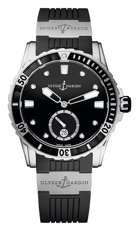 5. Ulysse Nardin Diver Lady 3203-190-3/12 Корпус из полированной нержавеющей стали. Безель с сине-чёрным вулканизированным каучуковым покрытием и одним бриллиантом весом 0,013 карата. Сине-чёрный циферблат с центральными стрелками часов и минут, малой секундной стрелкой, окошком даты, с условными накладными индексами, восемь из которых являются бриллиантами общим весом 0,062 карата. Каучуковый ремешок сине-чёрного цвета, украшенный вставками из нержавеющей стали с логотипом Ulysse Nardin и раскладывающейся стальной застёжкой. |
