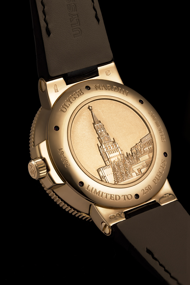 После того как был создан уникальный циферблат, Ролф Шнайдер пошёл дальше. На задней крышке часов из розового золота появился выгравированный силуэт Спасской башни и части Кремлёвской стены, прилегающей к ней. Если внимательно вглядеться в детали рисунка, то можно даже определить время на часах башни и мельчайшие детали всего строения. Часы имеют глубокий, чёрного цвета циферблат и ремешок такого же цвета. Всё это великолепие в сочетании с благородством розового золота, классическими римскими цифрами и уникальным дизайном стрелок притягивает взгляд.