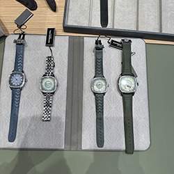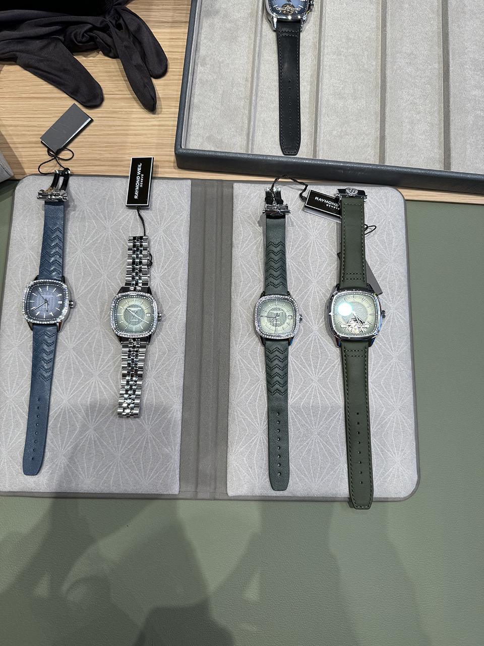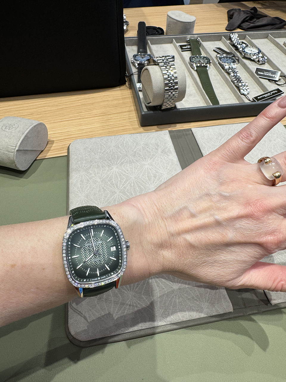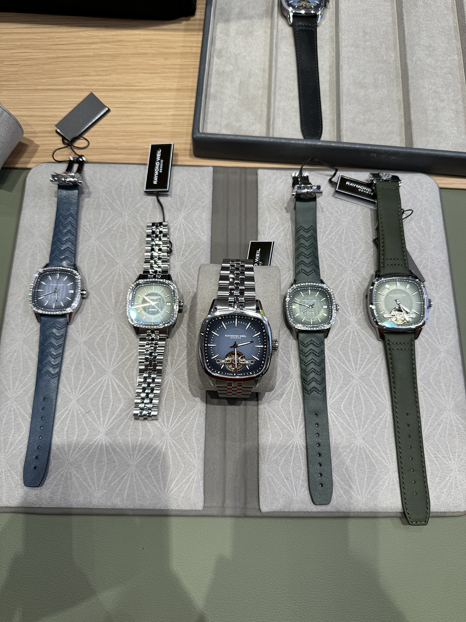 Также в конгресс-центре Watches and Wonders мы встречались с представителями Raymond Weil. У этого бренда модели очень необычной формы, похожей на “подушечку”, смотрятся интересно. Их выполнили в том числе в трендовом зеленом и голубом цвете, и надо сказать, что и в этих расцветках часы хорошо сочетаются с деловым дресс-кодом.