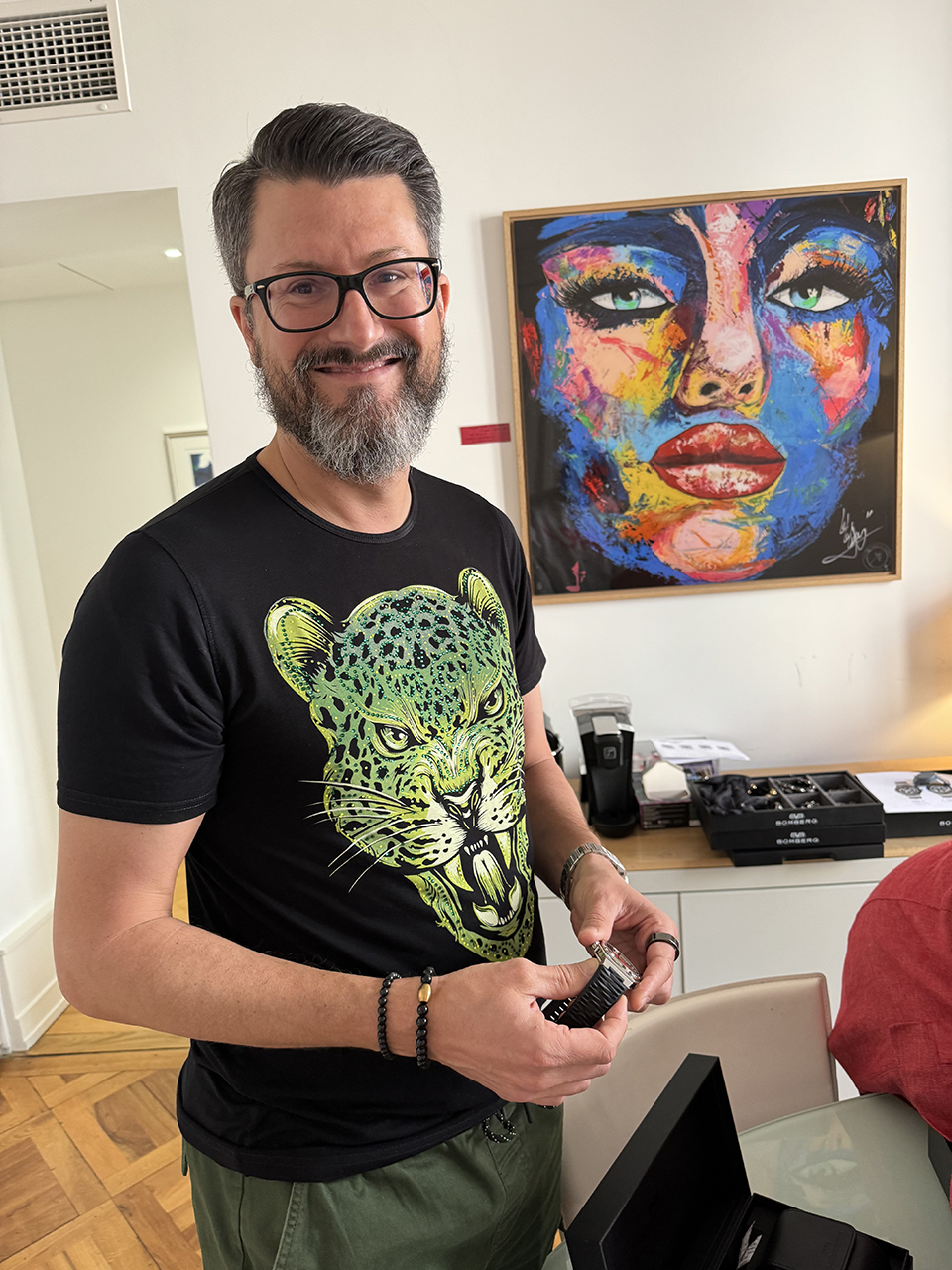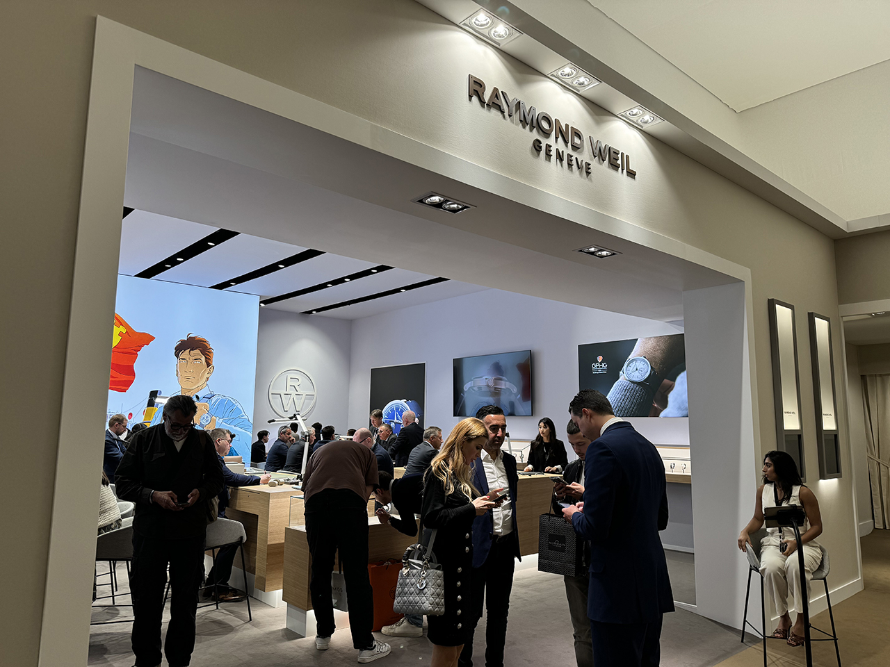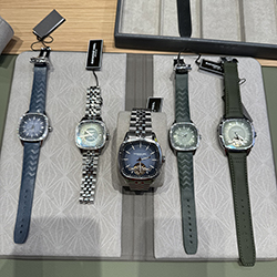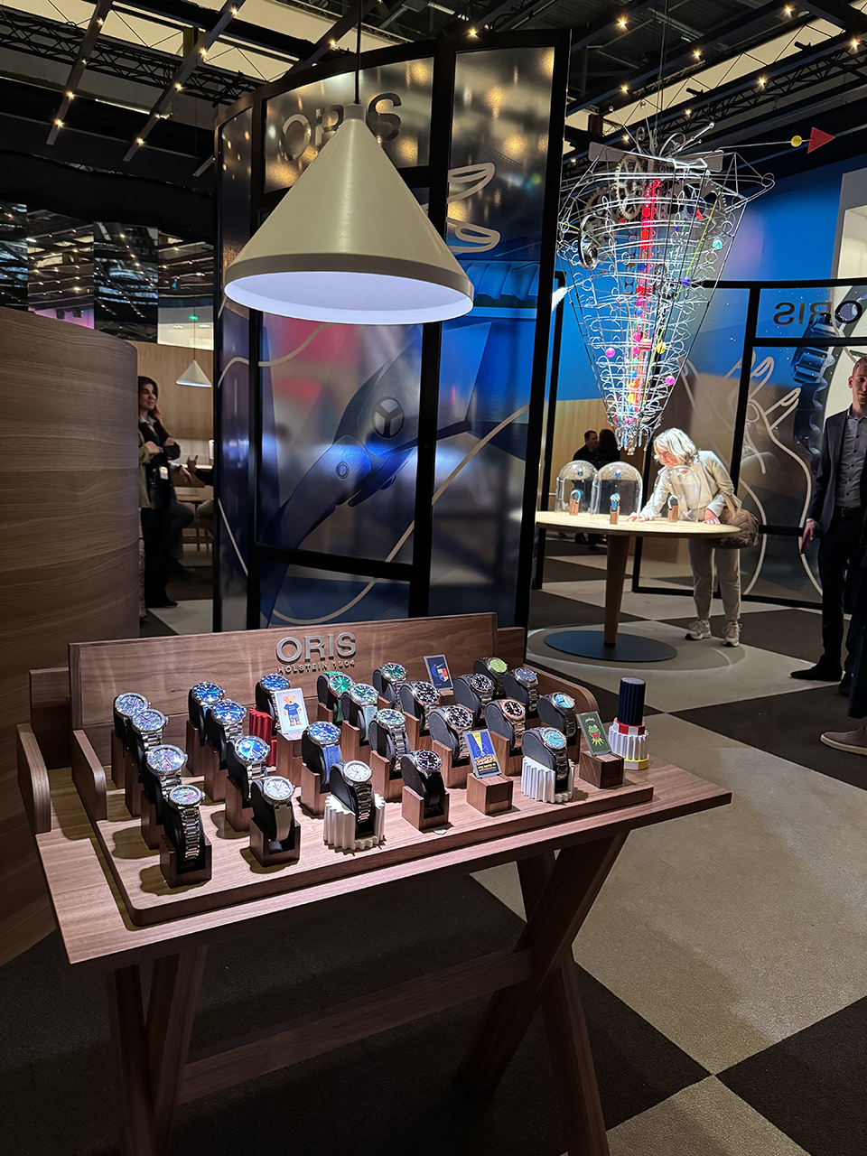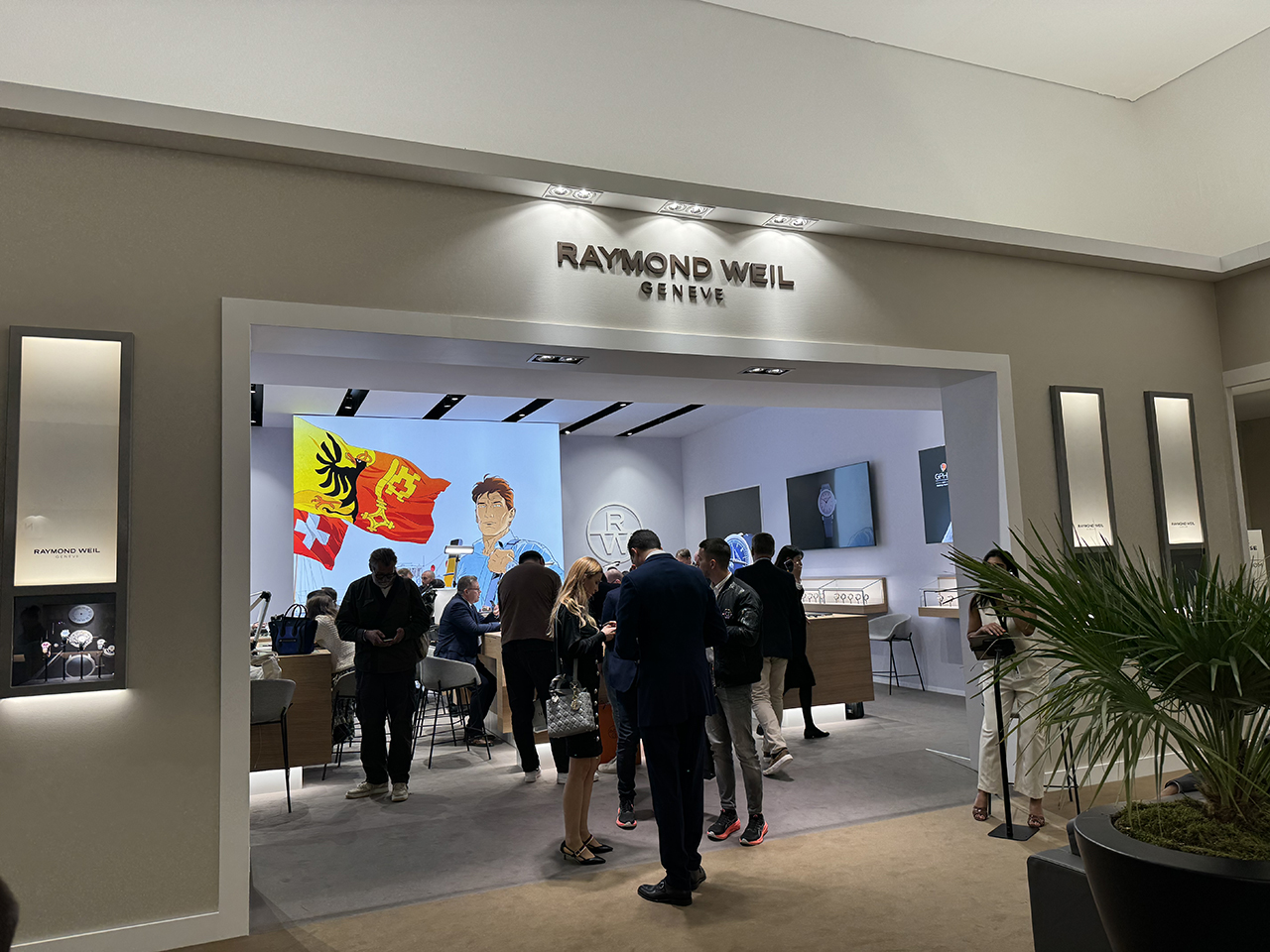 Также в конгресс-центре Watches and Wonders мы встречались с представителями Raymond Weil. У этого бренда модели очень необычной формы, похожей на “подушечку”, смотрятся интересно. Их выполнили в том числе в трендовом зеленом и голубом цвете, и надо сказать, что и в этих расцветках часы хорошо сочетаются с деловым дресс-кодом.