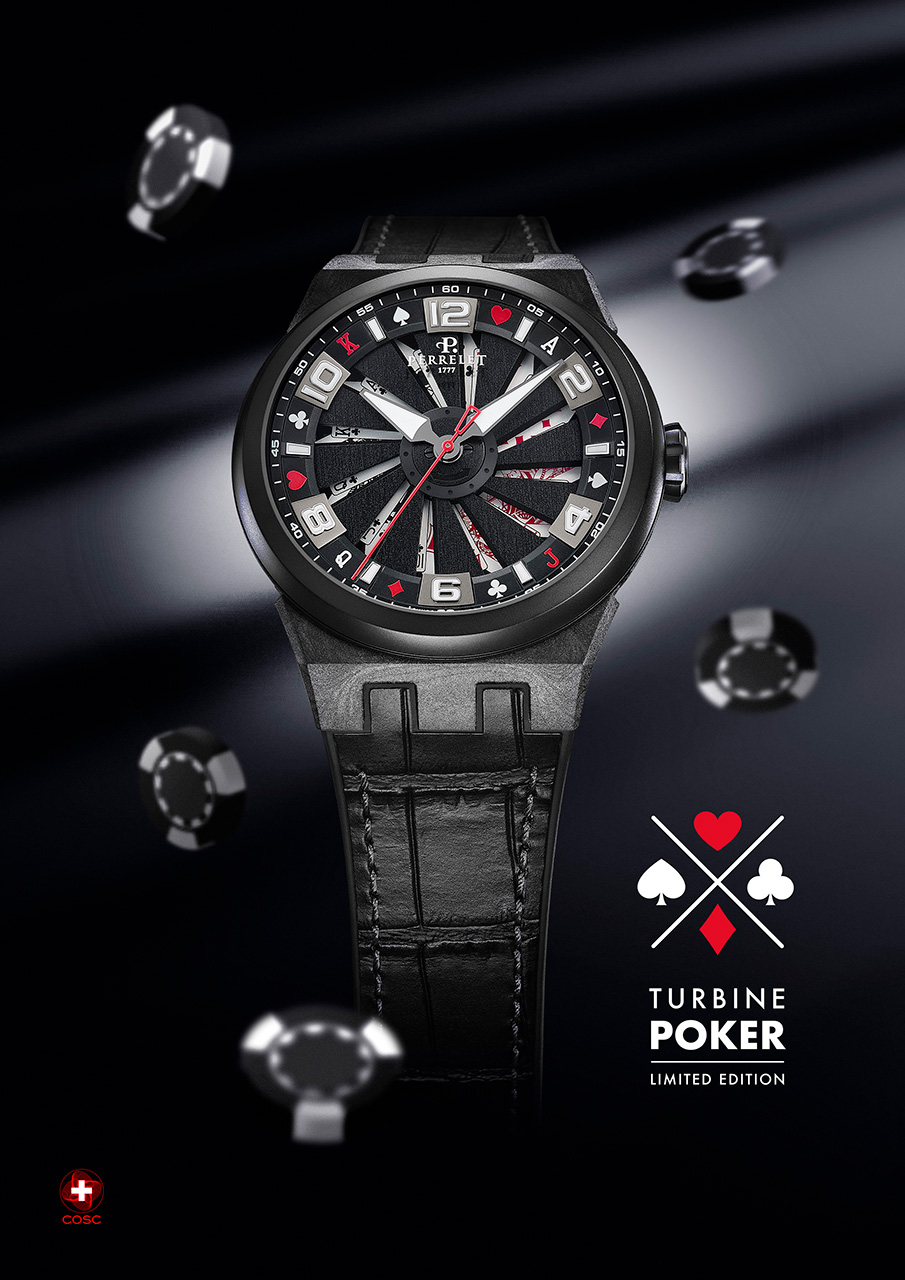 В 2024 году Perrelet предлагает новую модель, посвященную любителям зеленого стола: Turbine Poker Royal Flush, выпущенную ограниченной серией 99 экземпляров. В этой модели присутствует культовая запатентованная в 2009 году технология Turbine. Лопасти турбины приходят в движение при малейшем движении запястья и возвращаются в исходное положение по завершении жеста, создавая приятный игривый эффект. В новой версии Perrelet представлены 12 карт: двойной роял-флеш и пара семерок. На часовой дорожке символы четырех мастей и цифры выделяются красным и белым на черном фоне, чередуясь с арабскими цифрами и индексами. Последние хорошо видны при любом освещении благодаря люминесцентному составу Super-LumiNova, который также подсвечивает стрелки.